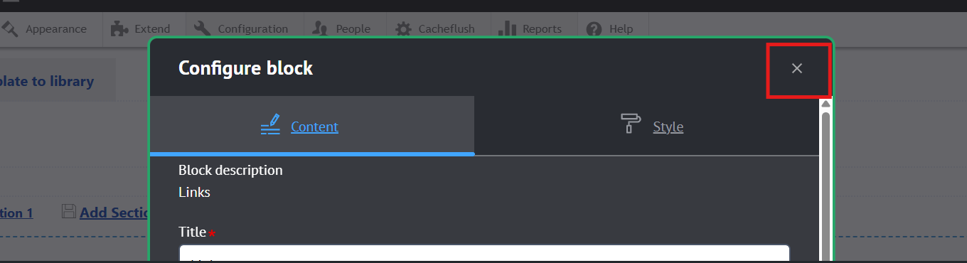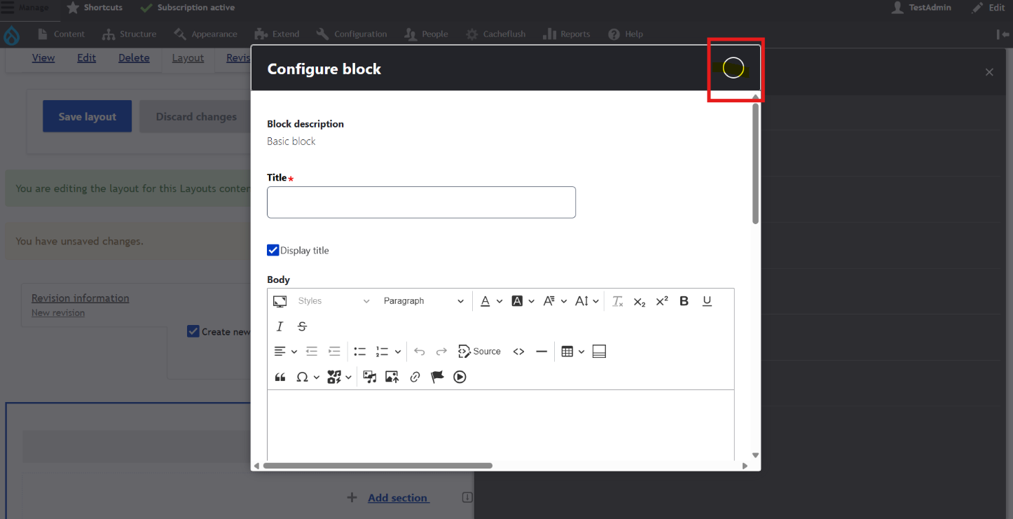 - Description of Issue: The block editing interface on Layout pages has an exit/close button that is invisible unless hovered over.