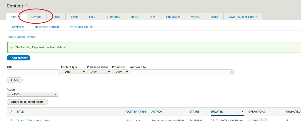 - Description of Issue: The ‘Layouts’ tab in the content module is confusing due to it being named identically to the ‘Layout’ content type